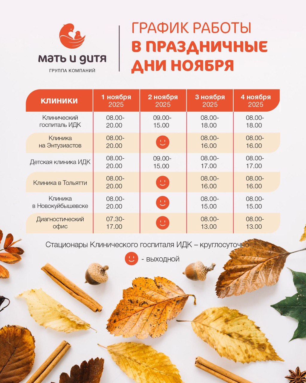 График работы клиник в праздничные дни ноября