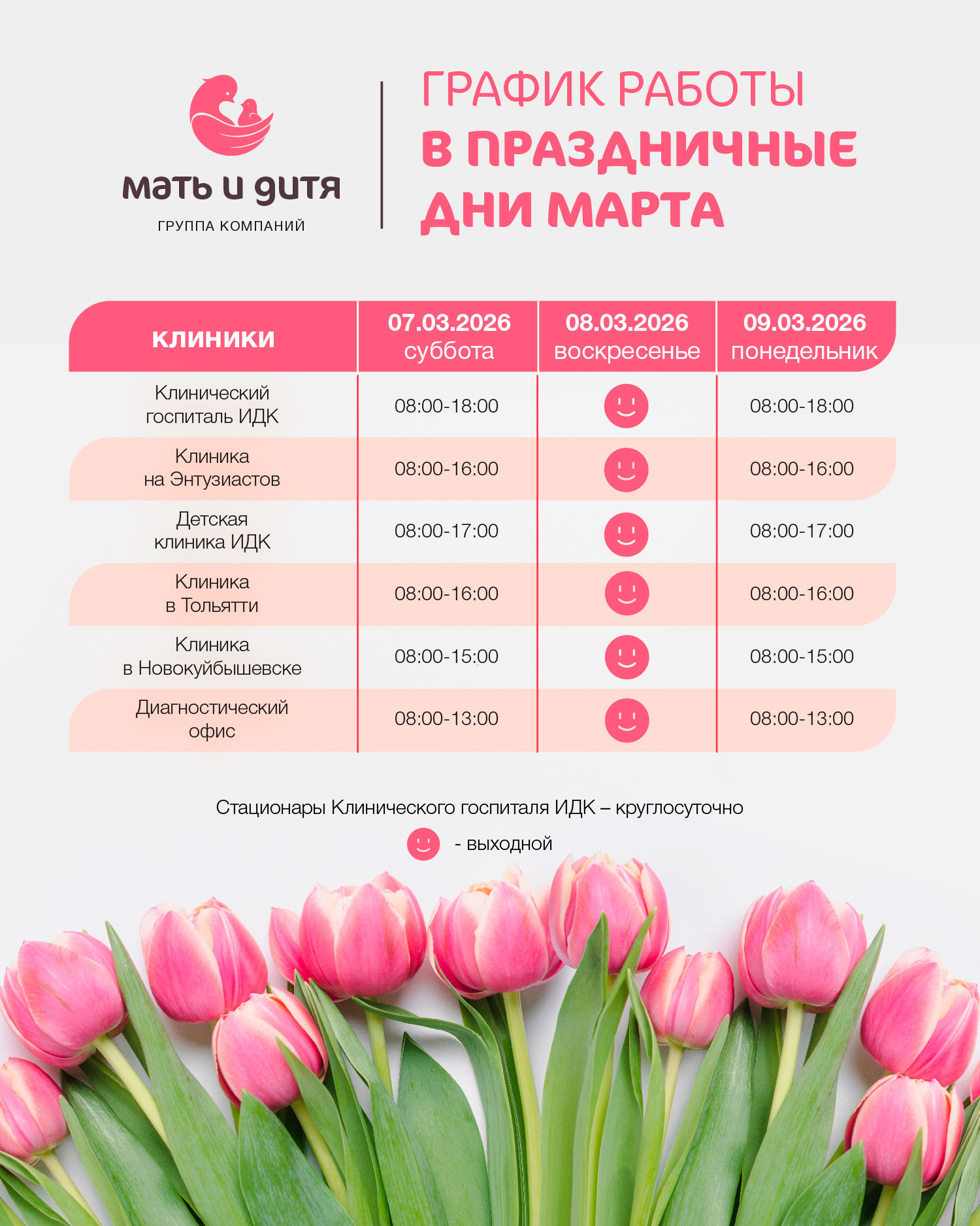 Информируем вас о графике работы клиник клиник «Мать и дитя-ИДК» в праздничные дни.
